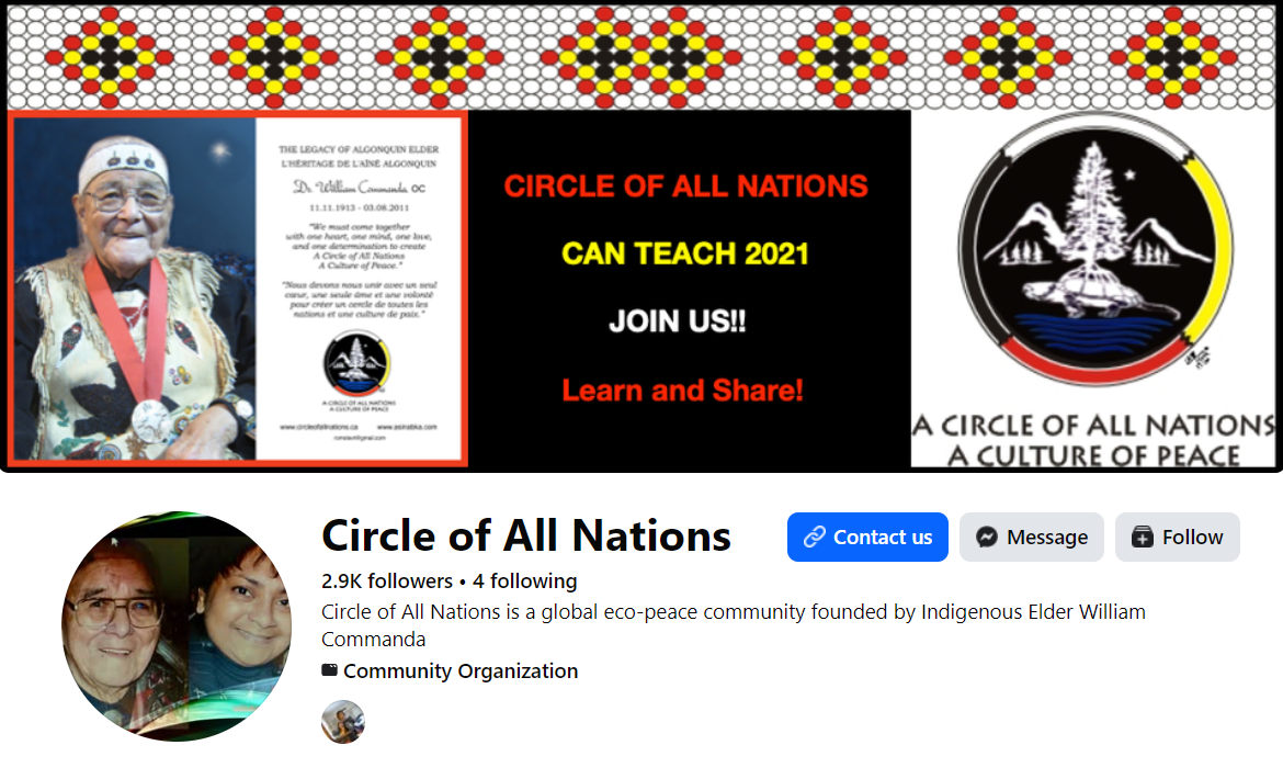 The Circle of All Nations Facebook page is a platform where the organization shares updates about its activities, events, and community initiatives. It provides information about upcoming gatherings, teachings, cultural discussions, and environmental projects inspired by the legacy of Indigenous elder William Commanda. Through posts, photos, and videos, the page helps connect supporters and community members while promoting the values of peace, respect for Mother Earth, and unity among peoples.