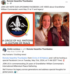 In honor of his legacy on the anniversary of his passing (coming up on August 3rd), I invite you to watch this Facebook Live from May 21, 2024, where I discuss with Romola Vasantha Thumbadoo and friends how William Commanda‘s extraordinary wisdom has deeply influenced my life and why it is essential for me to keep his legacy – Circle of All Nations – alive for future generations.